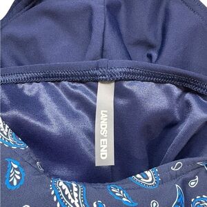 Lands' End one-piece swimsuit, size 22W. This plus-size model is designed for comfort and style. It features a beautiful blue and white paisley pattern on the top, contrasting with a solid navy blue bottom. The swimsuit has a rounded neckline, adjustable straps, and a lined interior with soft cups for excellent support. It also has a tie belt at the waist for a flattering and elegant look.
