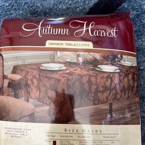 Brand new luxurious oblong/oval tablecloth that measures 60 inches by 120 inches. Napkins are 17 inches square. Made of 52% cotton and 48% polyester. From a smoke free home.