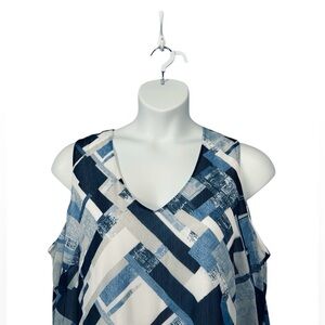 This beautiful Laura Plus sleeveless tunic is new and perfect for summer or a special occasion. The abstract pattern in shades of blue, grey, and white is both modern and stylish. The tunic is lightweight and flowy, with a spandex lining for optimal comfort. It features a V-neck and a loose fit that flatters all body types. It's ideal to wear with fitted pants or a skirt. New 🏷️ / 🚭