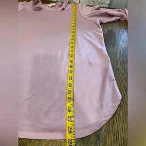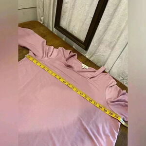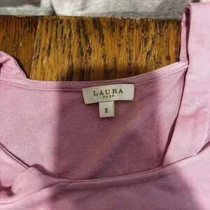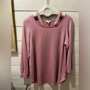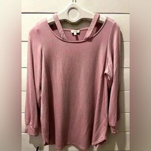 Ultra-soft pink jersey knit top from Laura Plus. Features a wide neckline with decorative straps, long sleeves with gathered cuffs, and a relaxed fit. Lightweight, comfortable and easy to style. Marked size X (Plus).