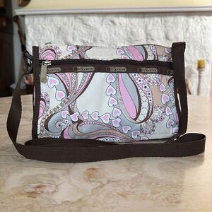 Never used, cute LeSPORTSAC Everyday crossbody bag in lovely brown, pink, tan and white tones featuring a classic Paisley print with hearts. Brown canvas adjustable strap, two exterior zippered pockets, main zippered compartment. Interior is in perfect condition, this cute bag is light and packable so perfect to take on trips.