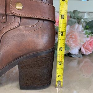 These are spectacular knee-high leather boots, new, without tags. The brand is Golo, and made in India. The photo attached from the Golo website is the closest style I could find and is for reference only. Buckle is removable and zippers function well. The leather is a distressed rich brown - the scuffing is part of the distressed look. Heels are 3" and boot is approx 19.5" tall.
