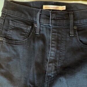 This is a pair of Levi's women's Mile High Super Skinny jeans in Black Haze, sized 27 x 30 (but looks tiny). Details: Ultra high rise with a super sleek silhouette. Levi's® Sculpt with Hyperstretch is an advanced blend of Lycra® and cotton fibers for extreme stretch. No tags, but never worn or washed. In excellent condition.