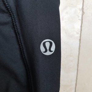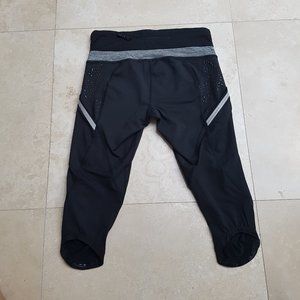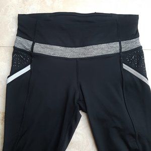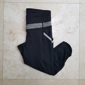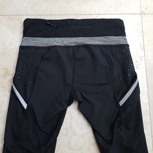Lululemon crop leggings in black and grey. Has 5 waistband pockets (4 hidden inside, 1 outside with a zipper), plus 2 side pockets. Grippy and reflective details on the sides as well - perfect for running at night. US Size 4 (but could also fit a size 2). Superb quality; I bought these a few yrs ago when Lulu made even better quality clothes. :)