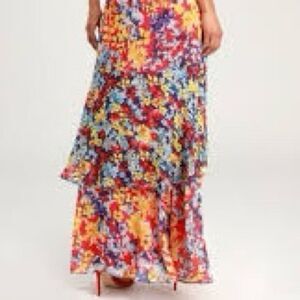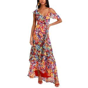 NWOT Lulus Radiant Ruby Red Floral Print Chiffon Maxi Dress Sz S