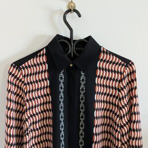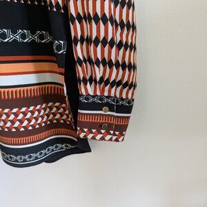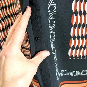 Anyhow, it’s chic… yet easy to wear, classic… yet very unique with its color geometric motif and blocking scheme. Wear it with tailored black pants for an instant elegant look for the office or a night out. The fabric is light and gorgeous and the shirt is really well cut and made.