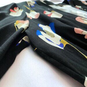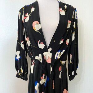 NWOT MASSIMO DUTTI BLACK FLORAL FRONT-KNOT MIDI DRESS STYLE 6643, this is a chic spring inspired black and white floral print - v-neck long sleeve midi dress in a 100% viscose sultry flowy fabric with a front tie-knot at the waist for a tailored and flattering touch for the silhouette - snap button on the neckline to keep it safely closed - collarless - unlined - long sleeves with gathered cuffs - side zip - perfect for work and night out, first date, fancy dinner at a restaurant, birthday party or a baby shower / gender reveal - easy to dress up or down with a white sandal or just ballerina flats for a more modest touch.