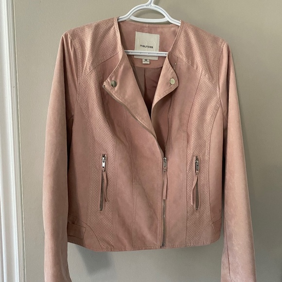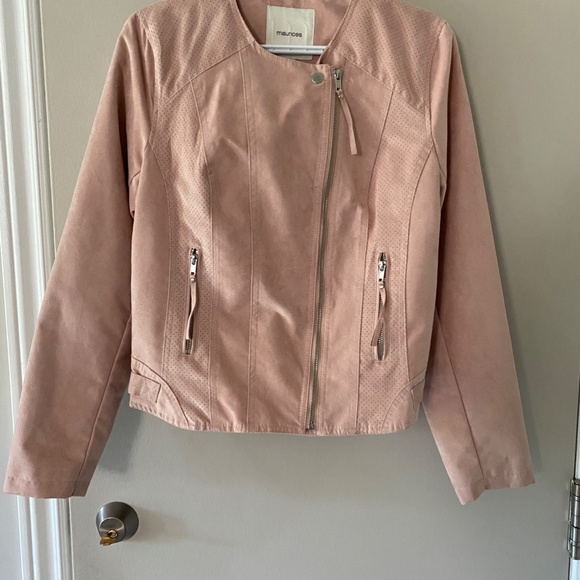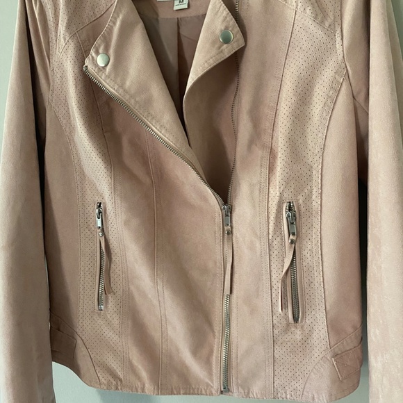 Very soft blush pink faux suede moto jacket with waterproof lining on the inside from Maurices. Never worn, like new condition.