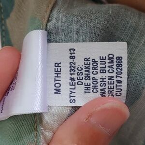 MOTHER The Shaker Chop Crop Camo Pants Size 27. Toughen up your off-duty look with these killer camo Chop Crop pants from cult-fave brand MOTHER. Made from a lightweight linen-cotton-lyocell blend, they’re soft, breathable, and ready to cause some trouble. Size 27 approx. 11" rise, cropped raw hem. Relaxed fit with that perfect slouch. Linen blend = summer-ready. Iconic camo print. NWOT never worn, tags off. Pair 'em with a ripped tee, combat boots, or your grungiest sneakers. These are not your basic cargos. Sold out & hard to find — grab them before they're gone. New to poshmark? Sign up with my code Jstewart261 to receive $15 off your first purchase.