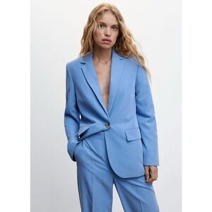 These Mango trousers feature a sophisticated wide-leg design in a soft blue hue, offering a tailored yet relaxed fit. The high-waisted style and minimalist lines make them perfect for both professional and formal settings. Crafted from a lightweight, structured fabric, they provide an elegant drape and modern aesthetic.