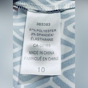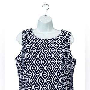 Made from a blend of polyester and spandex, it offers comfort and flexibility. Its bold navy and white geometric pattern adds a modern touch. The sleeveless cut and zippered back make it easy to wear. Perfect for the office, a special event, or a casual outing. New 🏷️ / 🚭