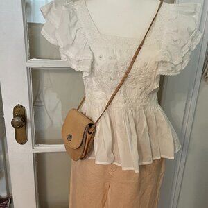 Pair with a crisp white blouse for chic Southern Europe aesthetic - example photos with items from my closet (sold separately) - Small Leather Vintage Crossbody/Saddle Bag in Tan Brown & Delicate All-white Ruffled Cotton Top