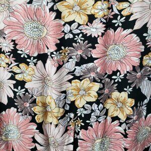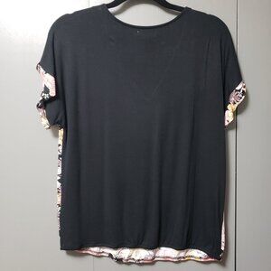 Front 100% Rayon Back 95% Rayon / 5% Spandex Regular Small Semi-relaxed fit NWOT (NEW without Tags). I cut off the tags when purchased but have NEVER worn. Front Floral Colours include light & dark pinks, light purple & yellow (see 4th close up image) Back is Black Features: - Soft & cozy fabric - Dolman sleeve detail - Elasticized waist - Floral print - Short sleeves - Studded strappy neckline Machine wash cold / Line dry Approx. flat measurements: P2P 20" Length (Shoulder to Hem) 24" Clean / Stored in smoke free home To reduce waste, clean recycled shipping materials are used whenever possible