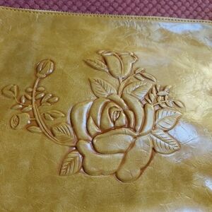Meitrue Medium Goldenrod Clutch/ Shoulder Handbag. Lovely rose engraved into bag. Shoulder length strap included, plus chain purse. Approx 14" x 8.5" x 5"