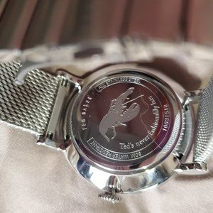 NWOT Men's 10031512 analog watch with grey dial and date window, stainless steel case and mesh band, the dial is approx 1.5 inch wide, water resistant to 50m. There is an extra link in the box.