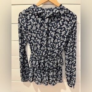 Elegant navy blouse by Michael Kors with a charming white floral print. Features include a V-neckline with tie detail, ruched bodice, long sleeves with buttoned cuffs, and a flattering peplum silhouette. Tagged size XXS.