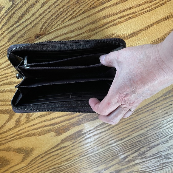 Full length zip around navy wallet with embossed purple and blue butterflies and red/pink flowers. 3 gusseted compartments, 1 zippered coin compartment, 2 bill slots, 8 credit card slots. Zipper pull has two small charms. Not sure of the brand name or material (not leather). Never used.