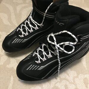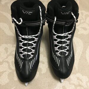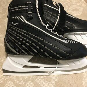 Excellent unworn condition, black and white VIC soft recreational ice skates. In great shape and still include the blade guards.
