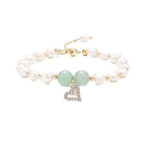 NWOT Natural Green Aventurine & Pearl Beaded Bracelet W CZ Heart Charm