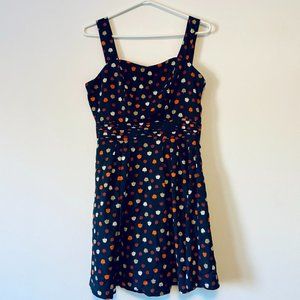 - Dark navy blue with brown, off-white, burgundy, and orange apples
