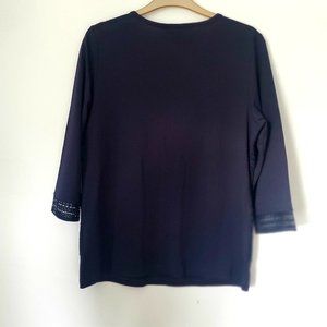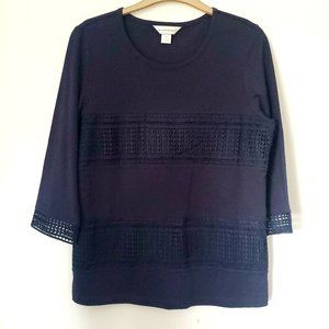 NWOT* Navy Blue Crew Neck Top Crocheted Accent Trim 3/4 sleeve Nautical Basic