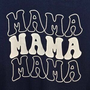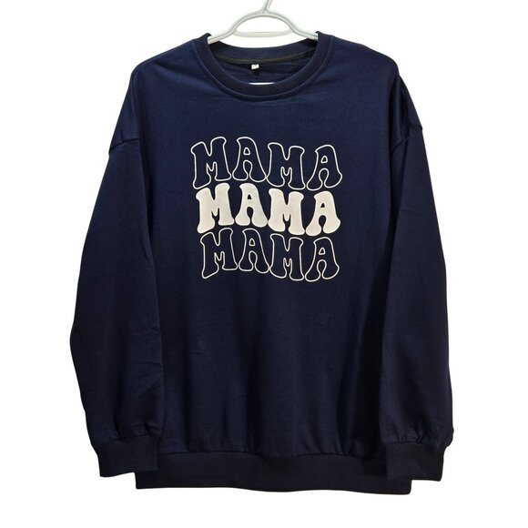 This is a brand new (NWOT) navy blue sweatshirt featuring a fun, stacked "MAMA" graphic in a retro font. It has a classic crew neck and long sleeves, with a comfortable oversized fit. The interior appears soft (likely fleece or brush-backed), making it a cozy choice for casual wear, errands, or gifting to a new mother.