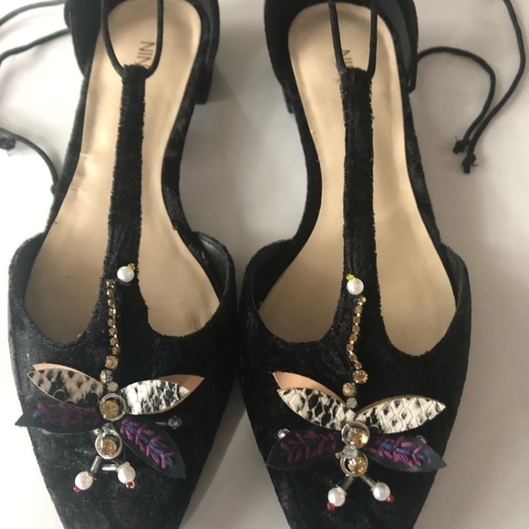 I adore these shoes!! I’m sad to part with them. Black , flats, with a delicate tie for the ankle and look at the beautiful stones and beading o the toe! Love ❤️