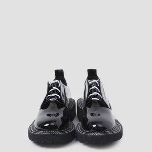 @shoshamj Hi they are patent leather and I am a perfect 10 and they fit like a 9.5, but seem comfy for the try on! They are brand new and have not been worn by me. The brand is in the description is it not? They’re not near me right now