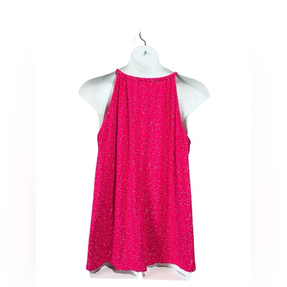 Lightweight and flowy fuchsia top with multicolor dots. Adjustable tie straps and gathered neckline. Stretchy and comfortable fabric. Perfect for warm weather — pairs well with jeans, skirts, or shorts.