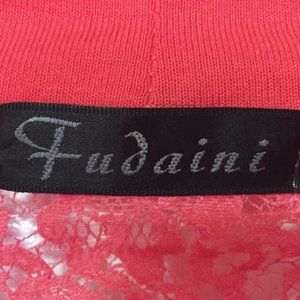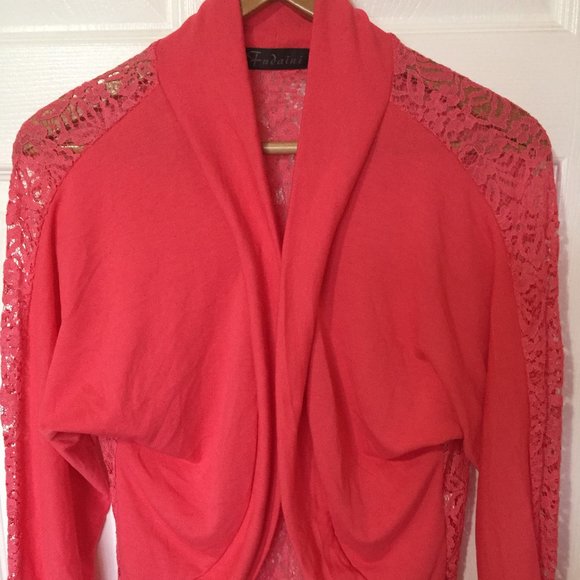 Hot pink long bat wing sleeve open front, cropped length shrug bolero cardigan w/ lace in the back, stretchy fabric. 65% cotton & 35% polyester. Great to compliment sleeveless dress or top, perfect for day/evening occasions. New without tag, never worn/washed, excellent condition/no flaws. Length (from top to hem): approx. 24", pit to pit: approx. 21". One size. Pet/smoke free home. Offers are welcome.