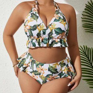 NWOT Plus Tropical Print Ruffle Hem Bikini Swimsuit