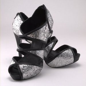 You will be the life of the party in these sparkly silver glitter and black leather heels! These shoes have never been worn. Black leather trimmed upper, insole and sole. Glitter upper. Small indent in leather insole from heel during storage but otherwise in perfect condition.