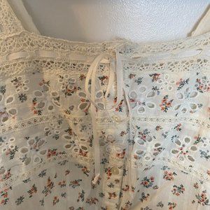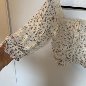 Never-worn AEO crop floral blouse. Smocked at the waist with a little ruffle; boho, bracelet-length sleeves. The length is perfect with high-waist jeans. The lace details and little bow are so pretty and feminine!