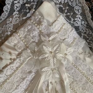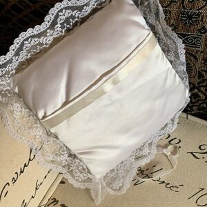 Soft Material, The ring bearer pillow made with durable soft satin, 5 ribbon strands and faux pearl strands with lace decor