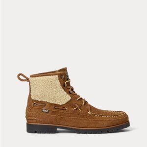 Constructed from rugged suede with faux shearling at the shaft, this utilitarian-inspired boot features rawhide lacing inspired by classic boat shoes. It is finished with a hand-stitched toe and a leather welt.