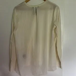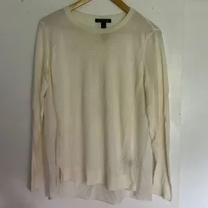 Size L, lightweight sweater on the front, polyester shell on the back- note this seam meets on the front, not side.
