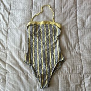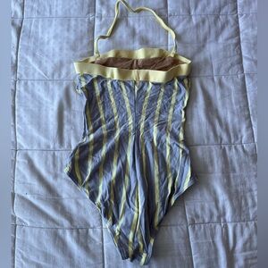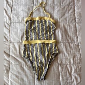 NWOT Rare Vintage Union Made Deadstock Yellow Grey Stripe Halter One Piece Swim