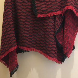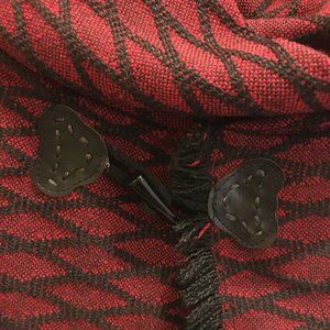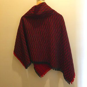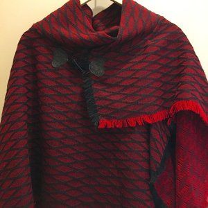 Excellent unworn/unused condition, red and black diamond patterned cape. Has a single black horn-like button closure in the front. This cape is lightweight and warm, but not too warm. Perfect for Spring and Fall. Super cute, but also elegant. This is so cool. This is so cool. Also includes a beautiful, large baubled safety pin for added closure.
