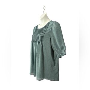 Beautiful plus size flowy blouse from the Signature Reitmans brand, size XXL/TTG, in an aqua color with subtle polka dots. This top features 3/4 sleeves with slightly ruffled cuffs, and a pleated yoke on the front for an elegant touch. Made from 100% polyester, it is lightweight and comfortable, perfect for any occasion. It has a lining for added opacity.