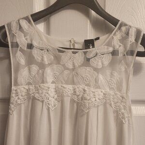 Soft lace and trim across the chest and an assymetrial hem that is flowy and flattering.