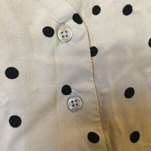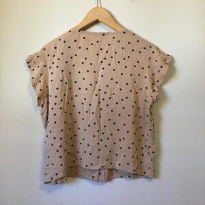 Very good preowned condition, pinkish-beige, cap flutter sleeve/almost sleeveless, button up, V-neck blouse with black polka dots scattered throughout. A little wrinkly from storage, but this top is in otherwise great condition. All natural material too by Givingz.