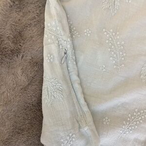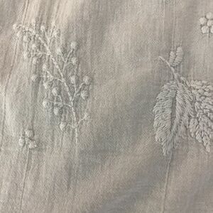 Really lovely shirt. Light blue with leafy branch raised print. Button front..Short sleeves. Standard fit.