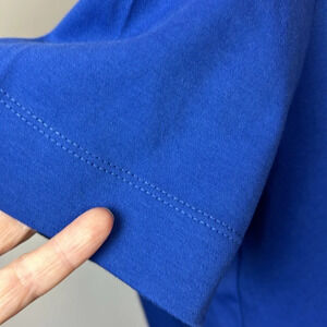 TIGI is a European brand and the quality construction in this piece really sets it apart. Easy care poly/cotton blend. Nicely finished with a wider than normal sleeve hem, reinforced side slits, stitching along the upper back, clear elastic stitched into the shoulder seams to help hold its shape, no puckers around the embroidery, pucker-free topstitching. Really a nice piece in a rich royal blue colour. Fits size 10-12.