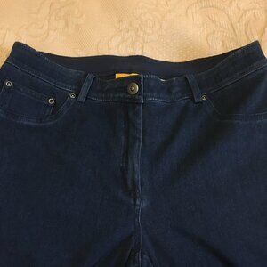 Very good preowned condition, dark, dark blue/almost black denim jeans by Ruby Road. I'm not sure why but I've always preferred very dark jeans over pale blue jeans as they look a bit more formal. Plastic tag and ribbon is still in tact on the back. They have been washed once however.