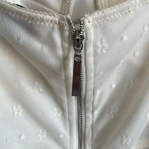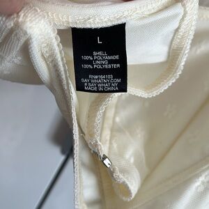 SAY WHAT NWOT This elegant cream bustier top offers a perfect blend of style and comfort. Ideal for layering or wearing on its own, it features delicate detailing for a sophisticated look. Adjustable straps for the perfect fit. Lace with floral design. Boning I’m back for support and zipper closure.