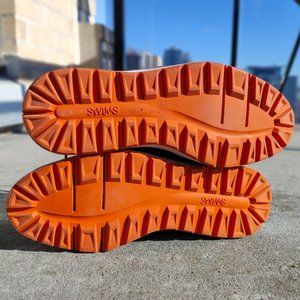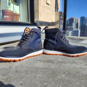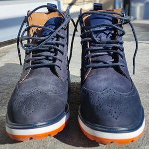 Spectacular SWIMS Motion Wingtip Boot in navy nubuck leather with a textile patch and phenomenally comfortable orange and white rubber sole.