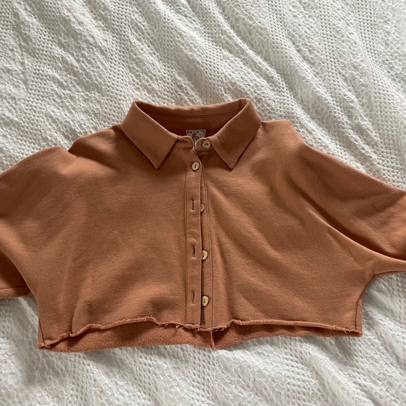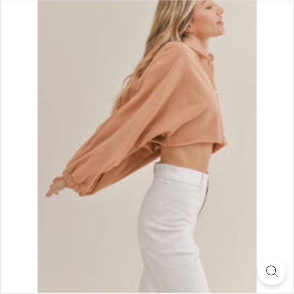 Most darling little piece for your wardrobe. Casual enough to match with anything, but cropped enough to keep it cute and a little bit edgy. Brand new without tags, never been worn. Stock photo is a perfect representation of the colour. Functional buttons, raw edge hem, with a generous sleeve and elastic cuffs. Look how sweet she is paired with some white denim! Love. Size S.