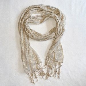Brand new without tags, never worn! Cream coloured scarf with gold thread for extra glimmer. Tasseled fringe on the ends of the scarf make this a great casual scarf for daywear, or to be worn as a shoulder wrap for events!