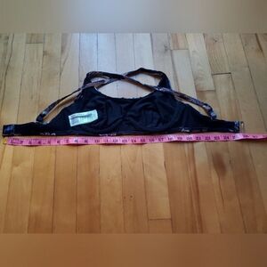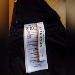 NWOT Seafolly Silk Road Scoop Neck Halter bikini top. Paisley print; flowers, leaves, birds. Black, blue, brown and white. Underwires. Side Boning For Shape Definition. Top size 4 US (Australian size 8), DD cup. See pictures for measurements. Adjustable shoulder straps, crossed in the back. No stain, no rip. Non smoking house.