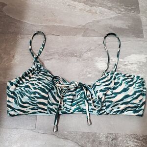 NWOT Seafolly Wild at Heart Drawstring Bralette Bikini Top. Green, blue, tan and a touch of cream; Color/ pattern is called Evergreen. Size 12 US (Australian size 16). No stain, no rip. Non smoking house. Removable Pads For Shape And Support, Adjustable Straps For The Perfect Fit, Back Clip Closure, Drawstring Detail.
